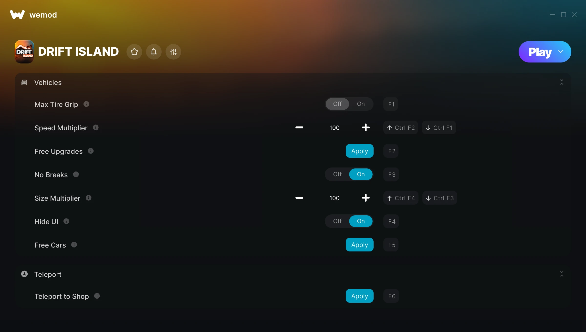 How do I use the cheats in DRIFT ISLAND?WeMod will safely display all of the games on your PC. Open a game from the list and simply press play. After the game loads and once you’re in-game, you can start enabling different cheats!Will this work with my game version?WeMod uses advanced technology to detect the game version you’re running and will let you know if it’s supported. If it’s not, you will still have the option of giving it a try or requesting an update!